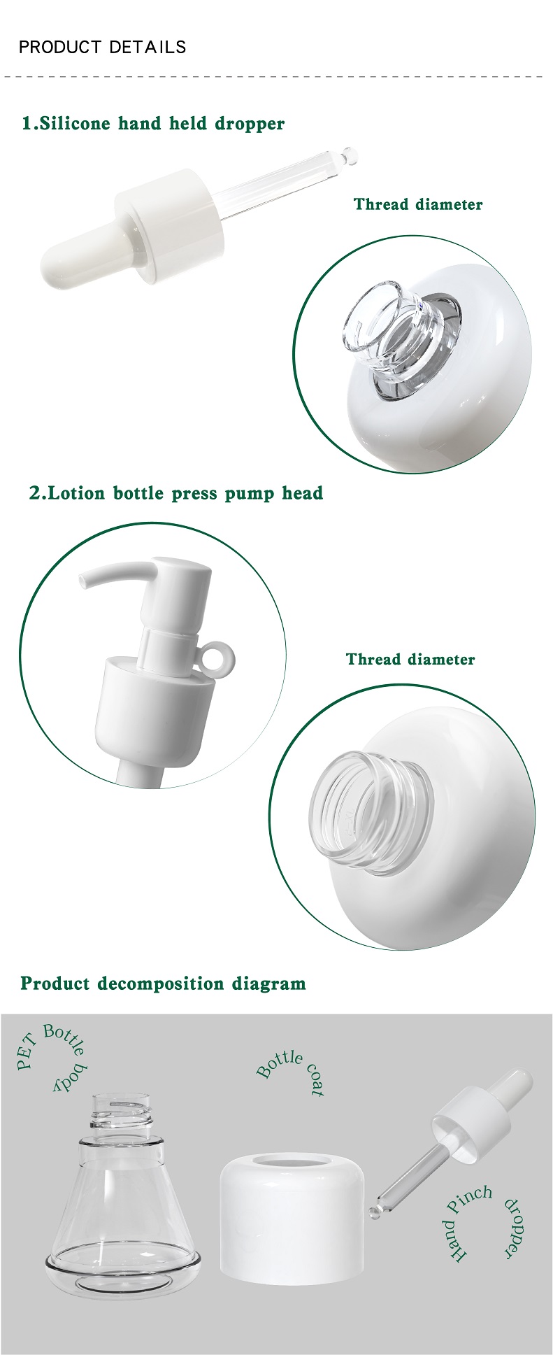 Material: Made from high-quality PET (Polyethylene Terephthalate) for the bottle, with an ABS (Acrylonitrile Butadiene Styrene) inner circle and a silicone dropper tip. All materials are eco-friendly, recyclable, and safe for cosmetic products.